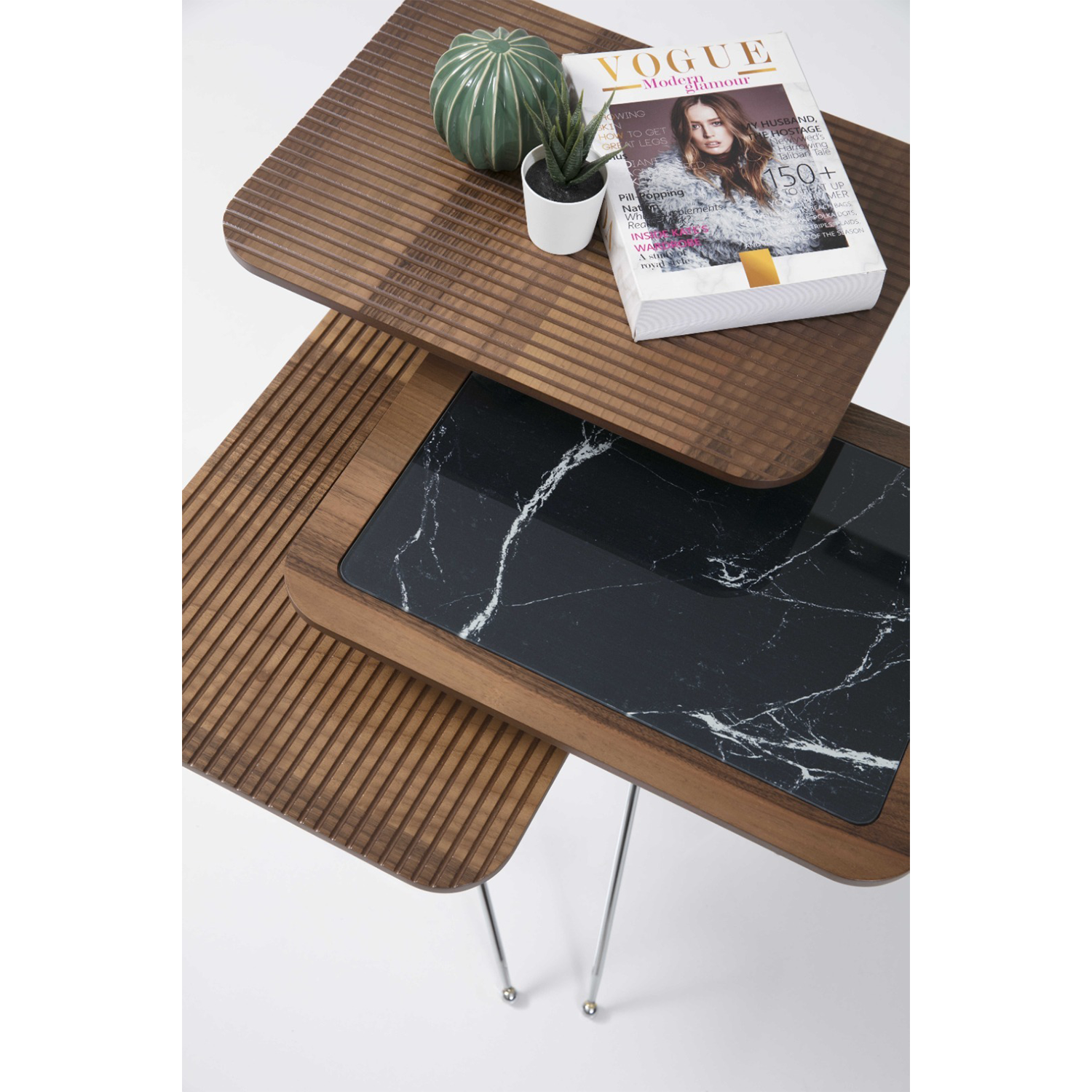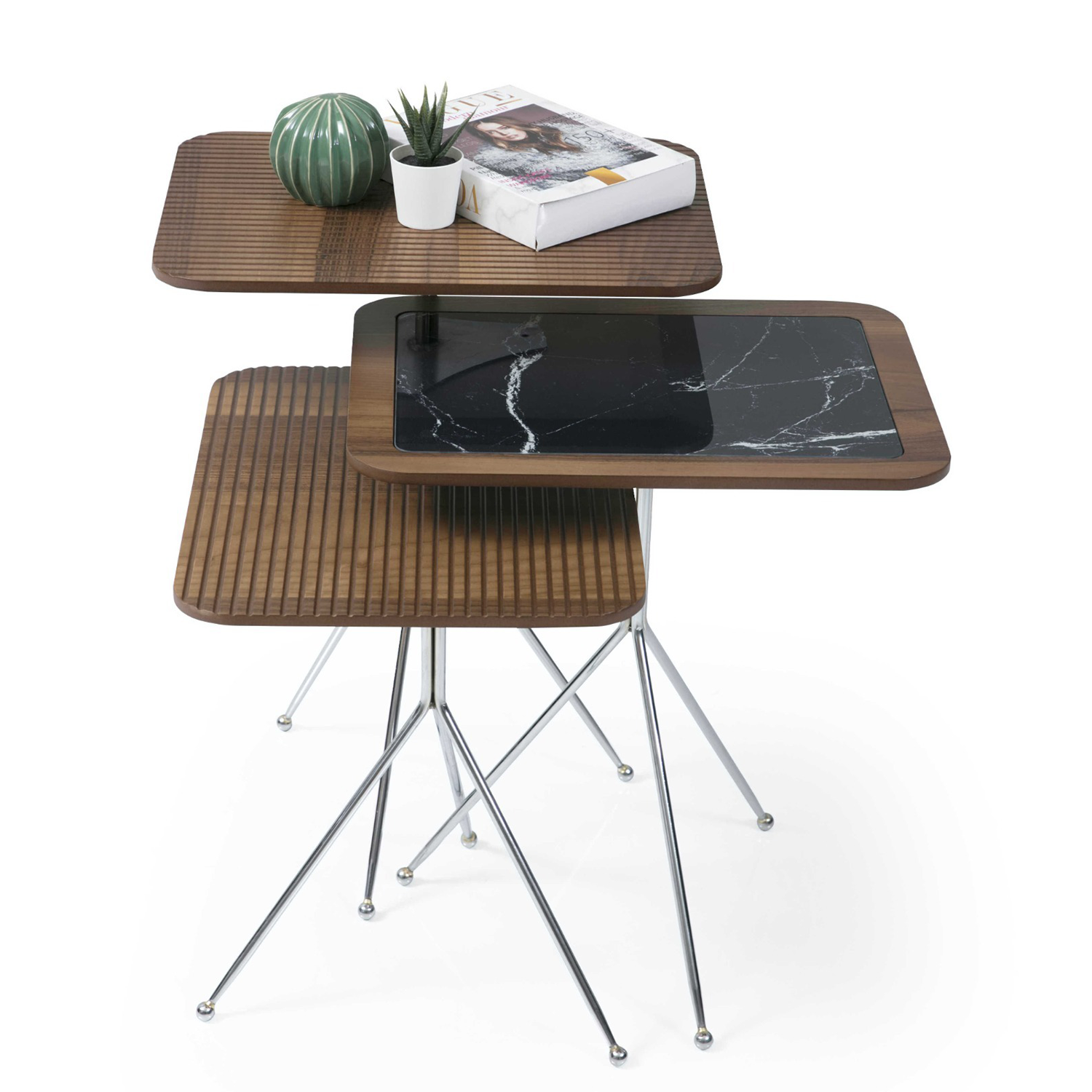 Diamond Zigon C-S, elmas desenli yüzeyi ve iç içe geçebilen tasarımıyla oturma odanıza zarif bir dokunuş katan zigon sehpa setidir. Ceviz-Siyah renk kombinasyonu ile sofistike bir görünüm sunar ve alan tasarrufu sağlar.