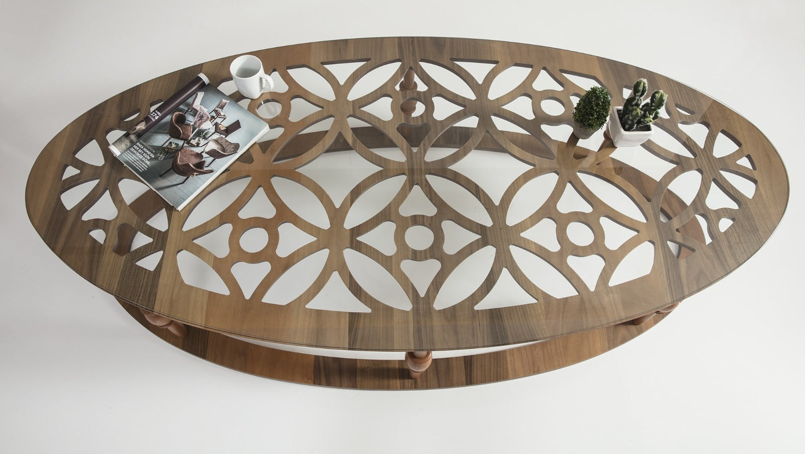 Evinizin havasını anında değiştirecek, dekoratif kesim detaylarıyla öne çıkan modern oval orta sehpa; hem estetik hem de işlevsel yapısıyla yaşam alanlarınıza zarafet katıyor. Dayanıklı ahşap gövdesi ve üst bölümdeki özel lazer kesim desenleriyle dikkat çeken bu parça, şeffaf cam yüzeyi sayesinde ferah ve hafif bir görünüm sunar. Salon, oturma odası ya da misafir alanlarınızda stilinizi tamamlayan şık bir odak noktası oluşturur. Dergi, mum, saksı bitkisi gibi aksesuarlarla mükemmel uyum sağlar ve uzun yıllar keyifle kullanılabilecek sağlam bir yapıya sahiptir. Üst tabla 18mm ceviz kaplamalı CNC kesim MDF 'den olup, üzerinde 8mm kırılmaz temperli cam bulunmaktadır. Kasa ve ayaklar tamamen fırınlanmış gürgendir.