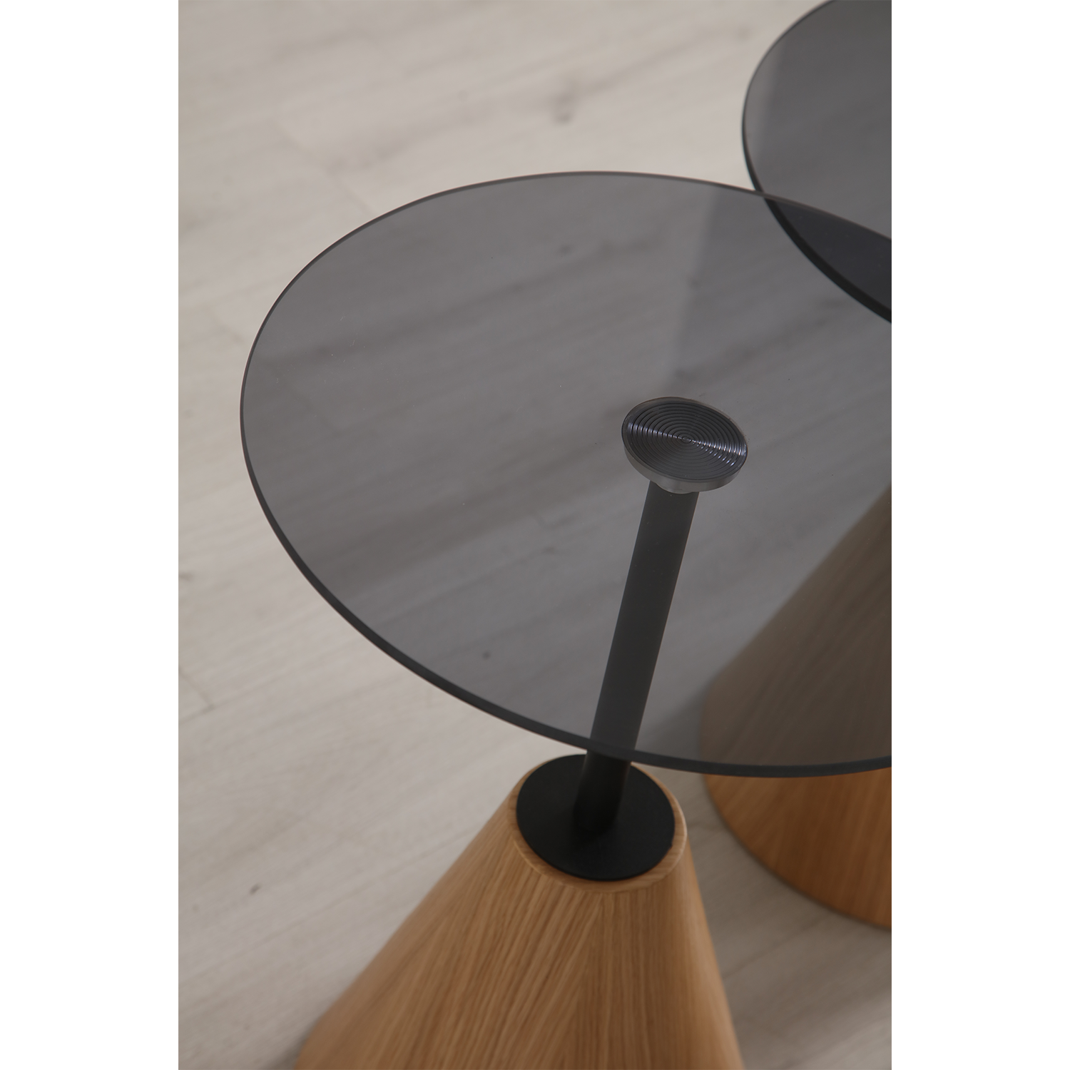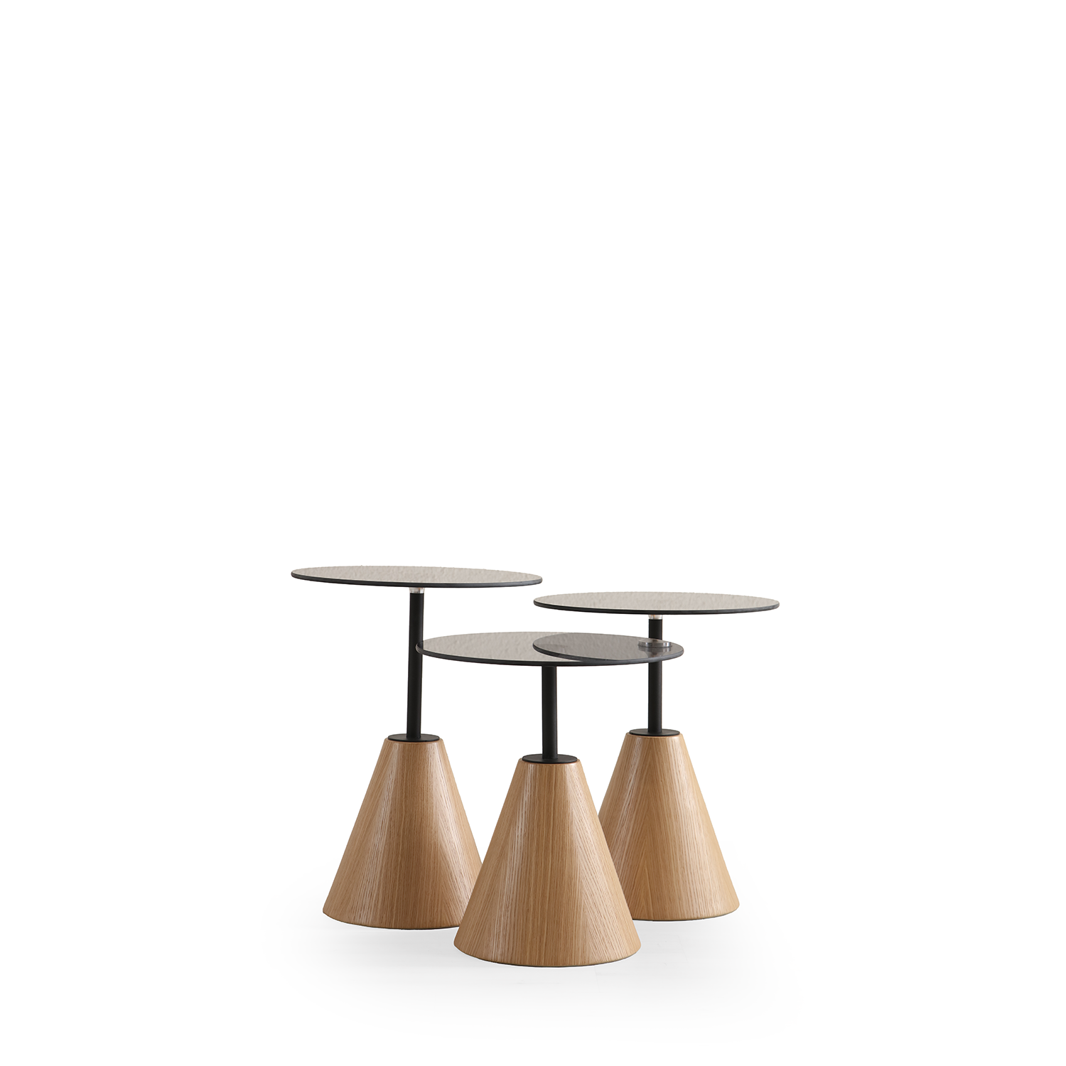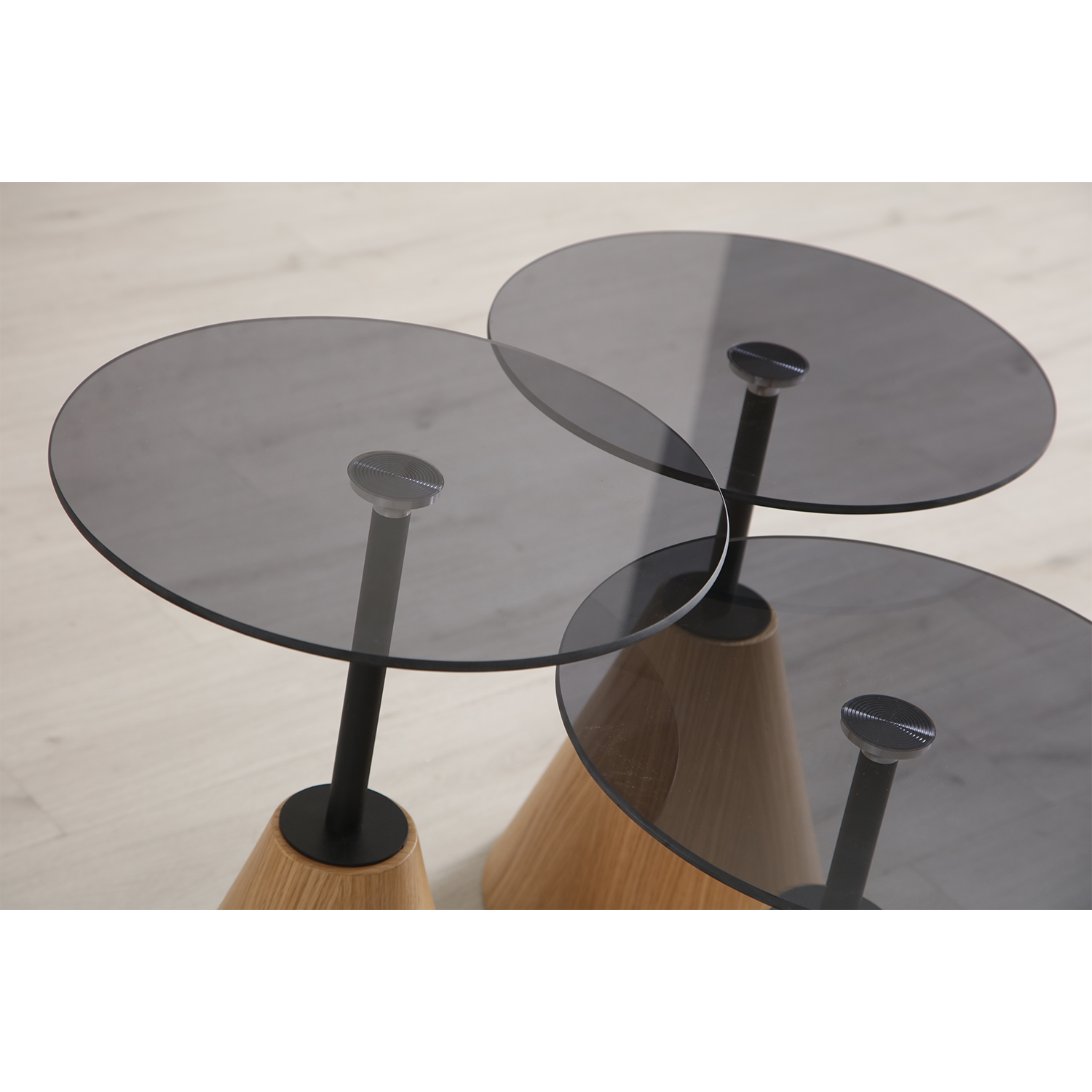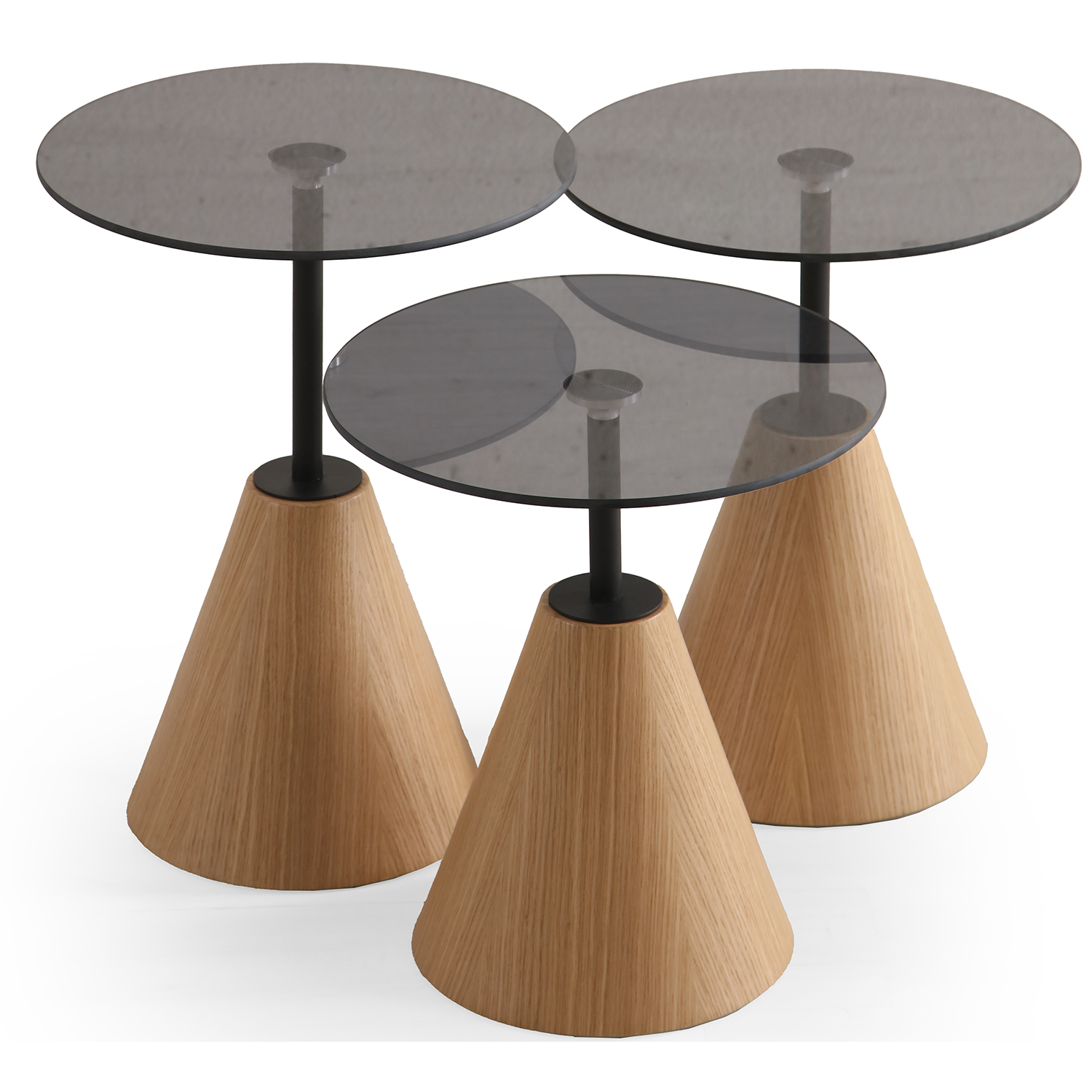 Ariel zigon sehpa, konik formdaki güçlü ayak yapısı ve ince metal taşıyıcı detaylarıyla modern tasarımın zarif bir yorumudur.; Farklı yüksekliklerdeki üçlü seti sayesinde hem dekoratif hem de fonksiyonel bir kullanım sunar.; Açık meşe dokusunun sıcaklığı, ince tabla çizgileriyle birleşerek yaşam alanınıza hafif ve modern bir görünüm kazandırır.; Hem salon hem oturma odasında yan sehpa, sunum alanı veya tamamlayıcı dekor parçası olarak ideal bir seçenektir.