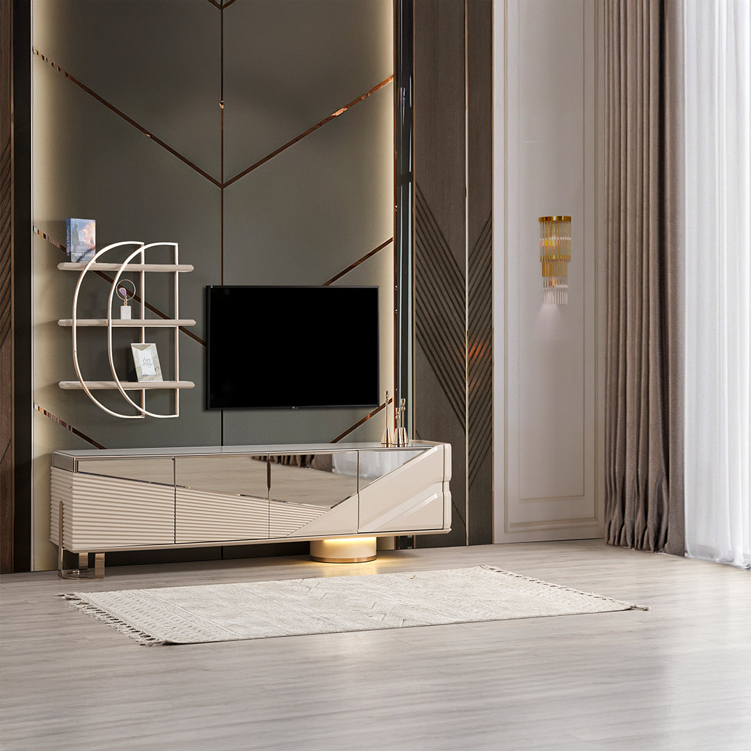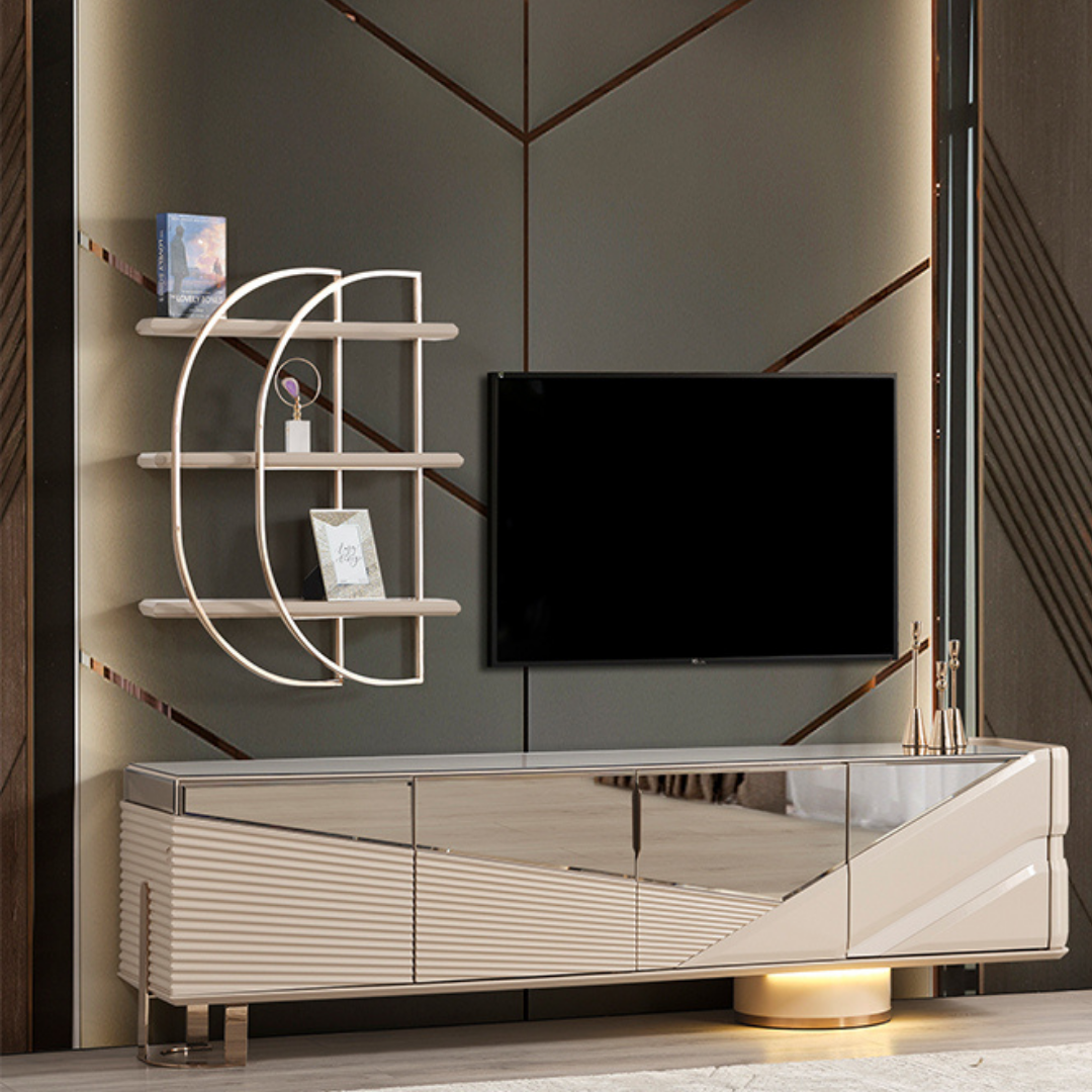 Auralux Tv Ünitesi, evinizin kalbinde şıklık ve işlevselliği bir araya getiren premium bir mobilya parçasıdır. Modern tasarımı ve kaliteli işçiliği ile oturma odanıza sofistike bir dokunuş katar.