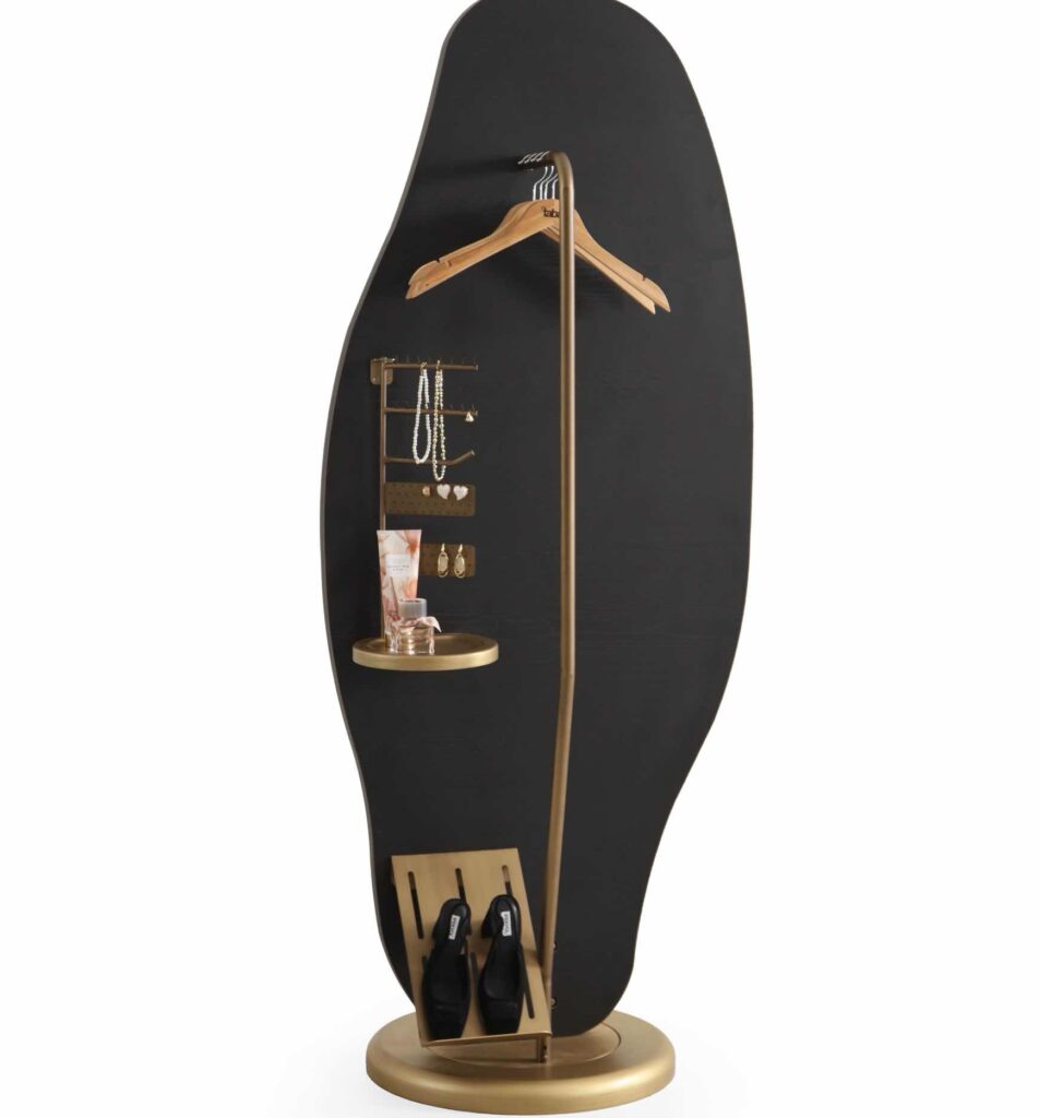 Modern çizgileri ve fonksiyonelliğiyle yeni boy aynamız sizlerle.360 derece dönebilen aynamız arkasında askılar ayakkabılığı ve rafıyla sizler için hem bir uşak hem de bir boy aynası.